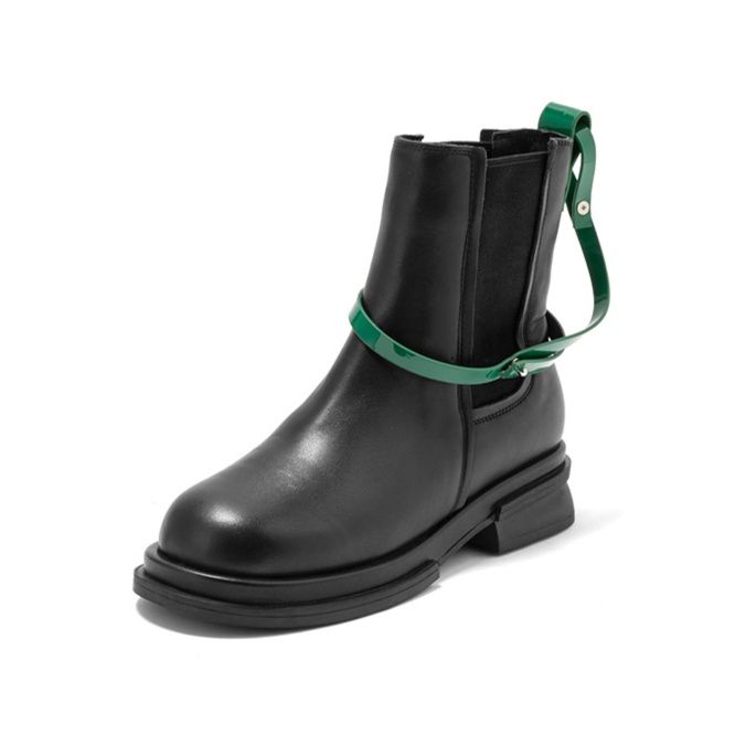サイドにゴアを備えたショートブーツに、個性的なカラーベルトをあしらったデザインが特徴的です。