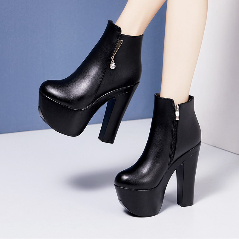 存在感抜群の厚底ブーツはスタイルアップ効果が魅力です。 超高ヒールと分厚いプラットフォームが脚長効果を発揮し、洗練されたシルエットを演出します。 サイドファスナーで着脱もスムーズで、ビジュー型のファスナートップがさりげない上品さをプラス。 滑らかな質感の合成皮革を使用し高級感があり、太めの角ヒールで安定感も抜群です。 カジュアルからきれいめまで幅広い着こなしに対応するブーツです。