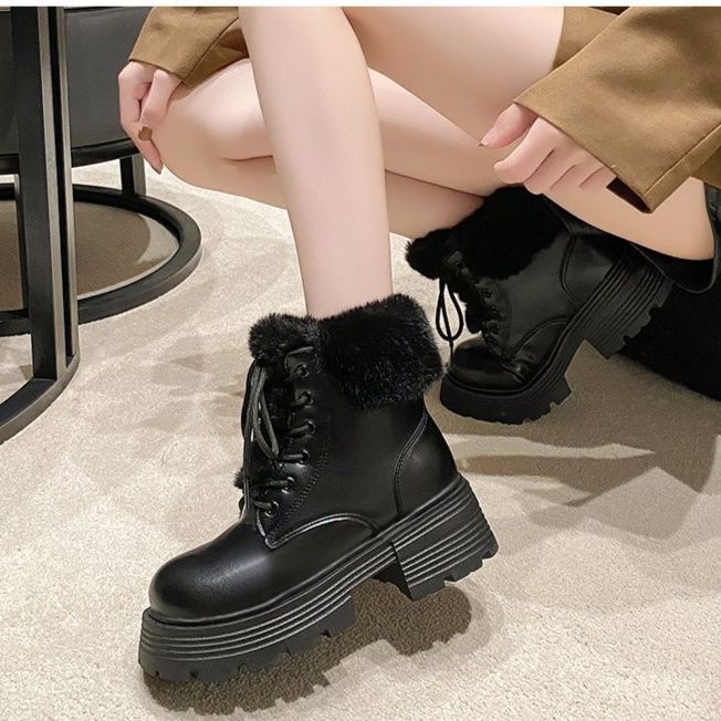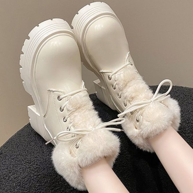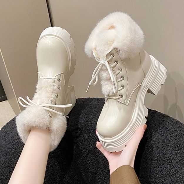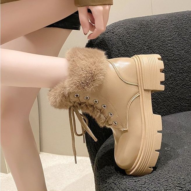 足元に存在感をプラスする厚底ソールが特徴のショートブーツです。 履き口を彩るふわふわのファーが可愛らしさと温かみを演出します。 レースアップデザインでフィット感を調節でき、厚底の安定したソールは歩きやすさも抜群です。 カジュアルからガーリーなスタイルまで幅広く合わせられる、秋冬シーズンに活躍するブーツです。