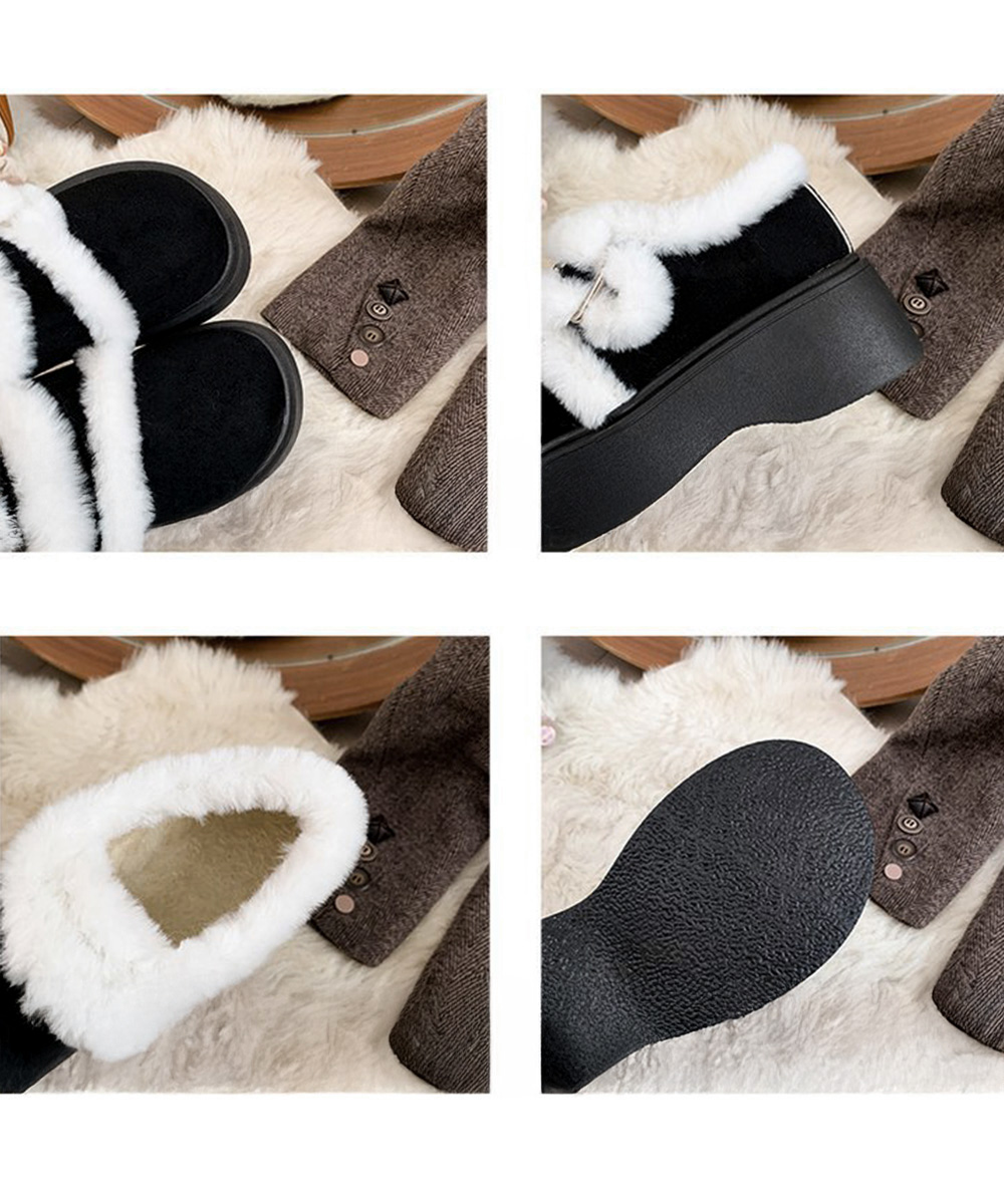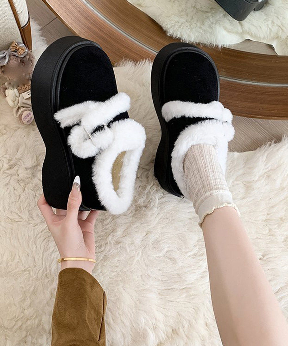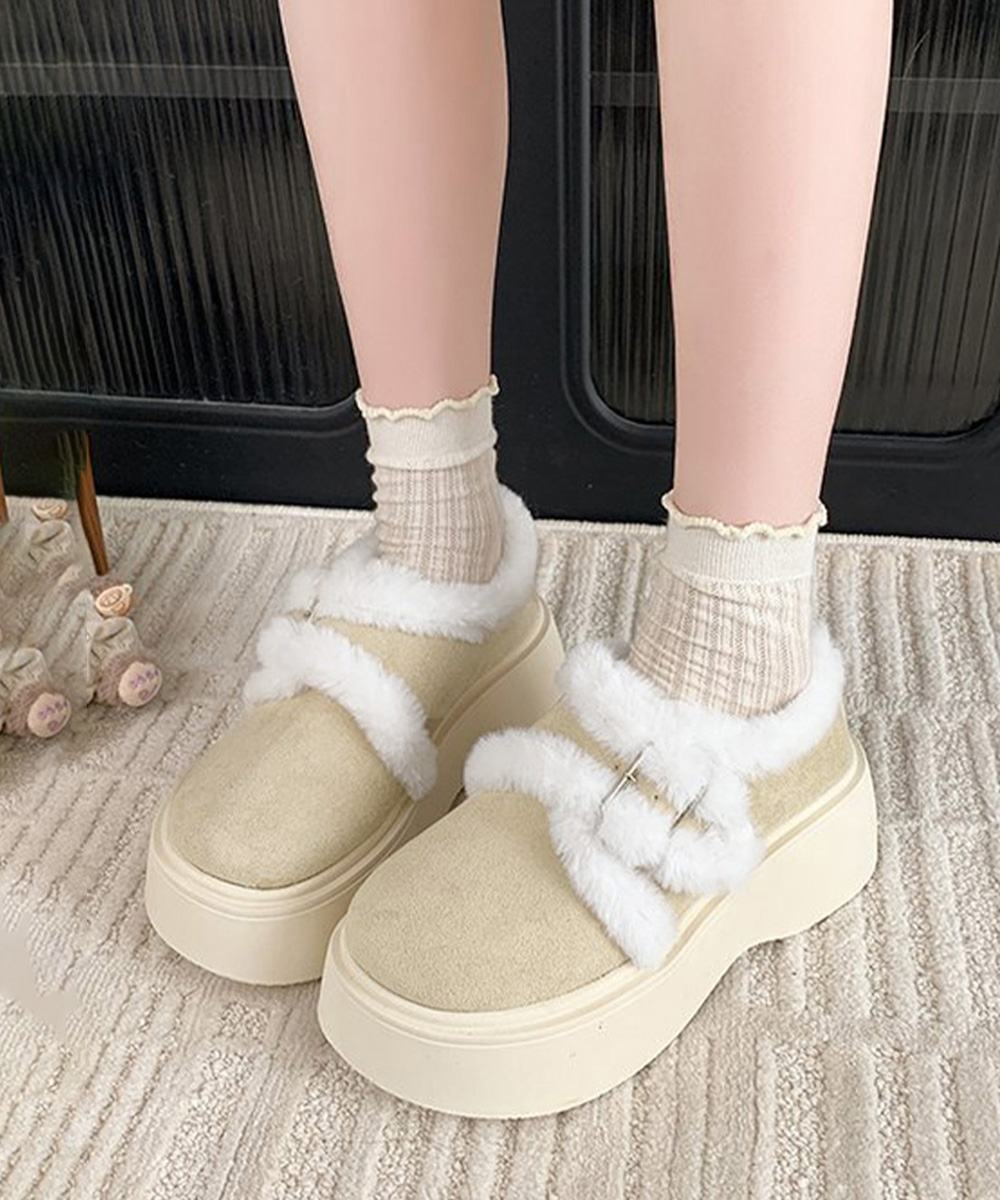 レディース韓国風 あったたかフェイクムートンスリッポンブーツ 厚底ショートブーツ 防寒保温ファーブーツ バックルデザイン 美脚脚長ブーツ暖か ふわふわ厚底ブーツ ファースリッポン冬 もこもこファーと厚底デザインで、ガーリーに楽しめる冬のあったかシューズ。 ファーストラップがアクセントになり、足元を可愛く演出。 ふわふわファーが足元を暖かく包み込み、防寒性も抜群。 ボリュームのある厚底ソールで自然にスタイルアップでき、安定感のある履き心地。 スカートやパンツにも合わせやすく、普段使いや冬の旅行コーデにもおすすめ。 甲素材:合成繊維 底素材:合成底 カラー:ブラック/ベージュ サイズ:22.5cm/23.0cm/23.5cm/24.0cm/24.5cm [22.5]長さ:約22.5cm 幅:約11.1cm ヒール:約5.3cm プラットフォーム:約3.7cm [23.0]長さ:約23.0cm 幅:約11.2cm ヒール:約5.3cm プラットフォーム:約3.7cm [23.5]長さ:約23.5cm 幅:約11.3cm ヒール:約5.3cm プラットフォーム:約3.7cm [24.0]長さ:約24.0cm 幅:約11.4cm ヒール:約5.3cm プラットフォーム:約3.7cm [24.5]長さ:約24.5cm 幅:約11.5cm ヒール:約5.3cm プラットフォーム:約3.7cm 重さ(両足):約685g-781g
