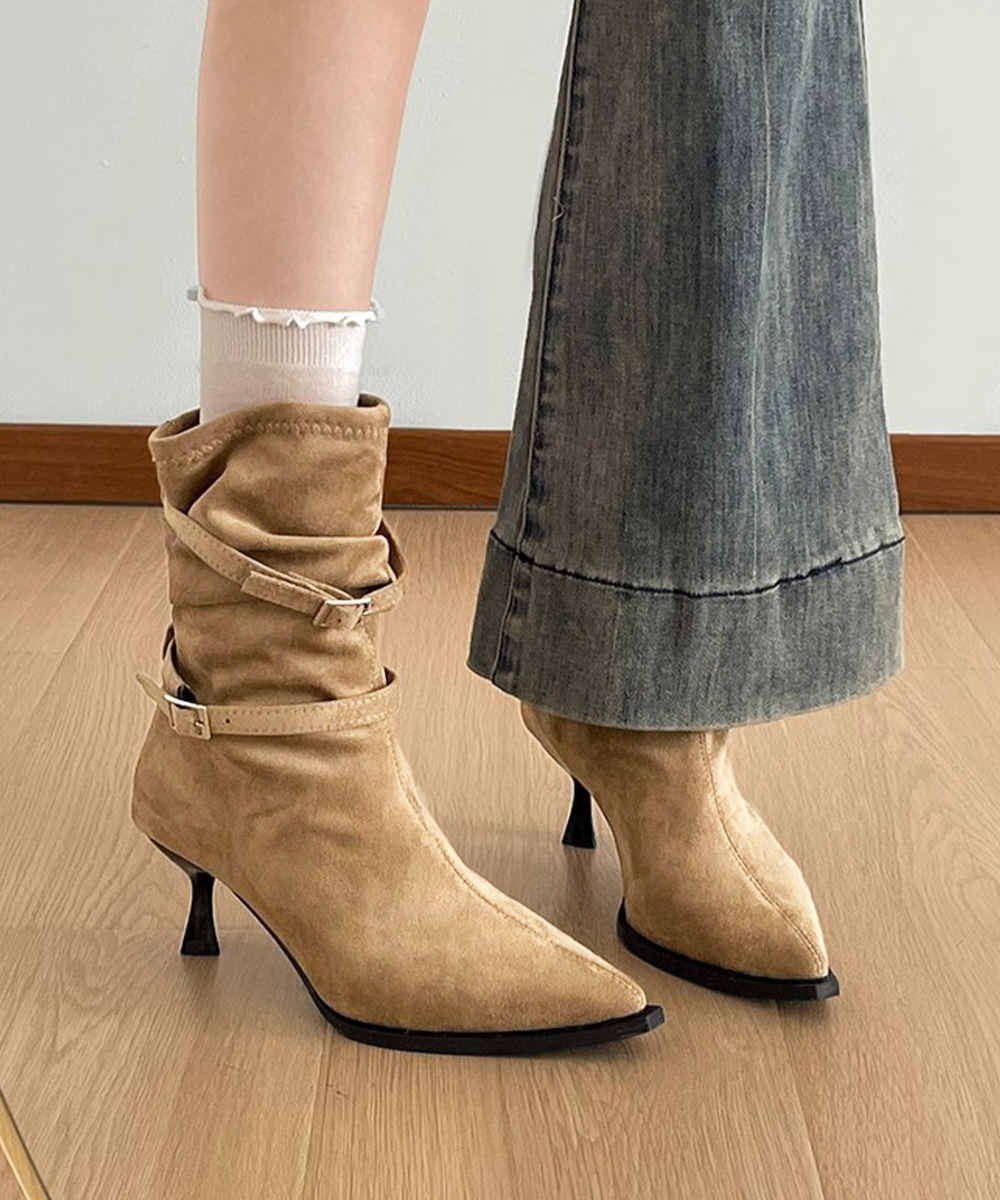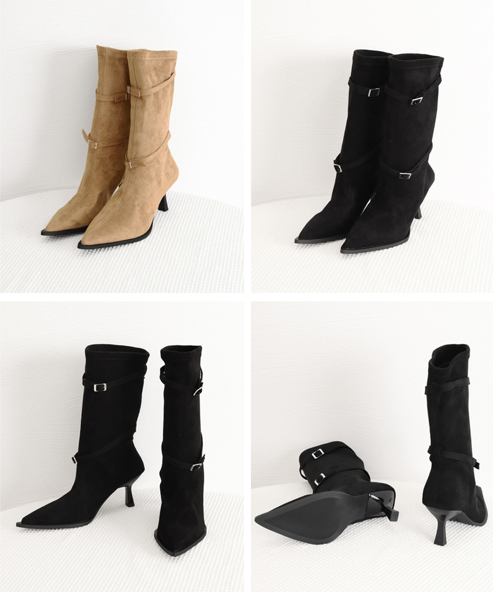 レディース ミドルブーツ 美脚ブーツ カジュアル 通勤オフィス おしゃれ フェミニン 歩きやすい 春秋冬 旅行 ピンヒールブーツ 大人ブーツきれいめ スエードブーティ しなやかなスエード素材に、中筒部分の細身ベルトが上品さを添えるミドルブーツ。 細めヒール×ポインテッドトゥの組み合わせが、シンプルながら大人の洗練された雰囲気を演出する。 程よい高さのミドル丈と、くしゅっとしたシルエットが脚をすっきりと見せてくれる。 ベーシックカラーのブラックとベージュ2色展開で、コーディネートを問わずにシンプルで合わせやすい一足。 甲素材:合成繊維 底素材:合成底 カラー:ブラック/ベージュ サイズ:22.5cm(35)/23.0cm(36)/23.5cm(37)/24.0cm(38)/24.5cm(39)/25.0cm(40) (カッコ内は靴底表記となります) [22.5]長さ:約22.5cm 幅:約7.7cm 筒丈:約21.5cm [23.0]長さ:約23.0cm 幅:約7.8cm 筒丈:約22.0cm [23.5]長さ:約23.5cm 幅:約7.9cm 筒丈:約22.5cm [24.0]長さ:約24.0cm 幅:約8.0cm 筒丈:約23.0cm [24.5]長さ:約24.5cm 幅:約8.1cm 筒丈:約23.5cm [25.0]長さ:約25.0cm 幅:約8.2cm 筒丈:約24.0cm 履き口周り:約28-37cm(伸縮性あり) ヒール(全サイズ):約6.5cm プラットフォーム(全サイズ):約0.5cm 重さ(両足):約450g-535g 生産国:中国 ※すべて平置きサイズです(採寸方法違いより、多少の誤差がございますので、ご了承ください)。 ※海外輸入品のため、商品の細部仕様は多少異なる場合がございます。予めご了承の上、ご注文お願い致します。