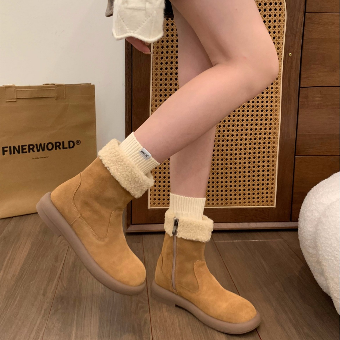 上質なベロア素材と落ち着いた雰囲気で大人の上品なコーディネートを演出するショートブーツ。