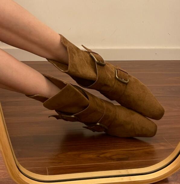 スエード調の上質な素材感とダブルベルトストラップがアクセントになった大人っぽいデザイン。